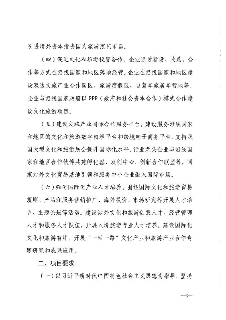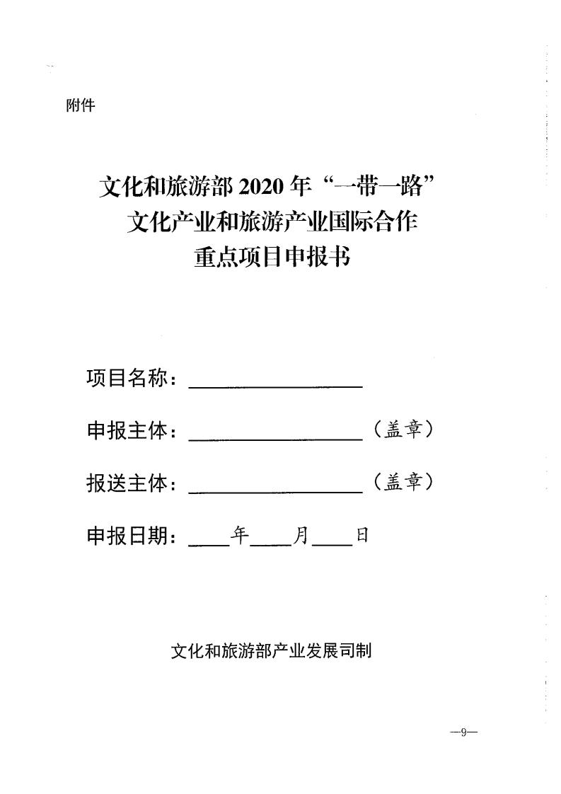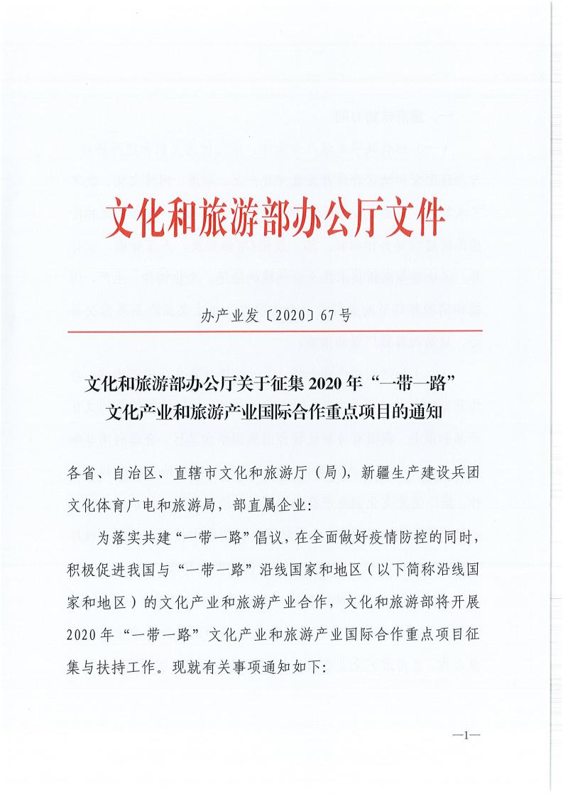 为落实共建“一带一路”倡议,在全面做好疫情防控的同时, 积极促进我国与“一带一路”沿线国家和地区(以下简称沿线国 家和地区)的文化产业和旅游产业合作,文化和旅游部将开展 2020年“一带一路”文化产业和旅游产业国际合作重点项目征 集与扶持工作。现就有关事项通知如下: